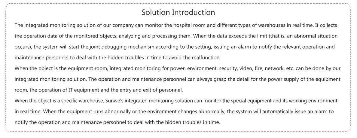 The importance of hospital is known to everyone as it isa guardian unit for people’slife safety.Special storage warehouses such as computer rooms, operating rooms, laboratories, refrigerationhouse, medical warehouses, etc. are importantplacesfor hospitals. These sites’ normal operationshould be guaranteed.Thus an integrated monitoring solution that can monitor the operation status of these sites at any timeis very necessary.
