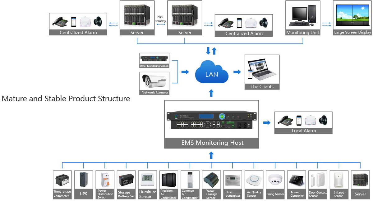 When the is the equipment room, integrated monitoring for power, environment, security, video, fire, network, etc. can be doneby our integrated monitoring solution.The operation and maintenance personnel can always grasp the detail for the power supply of the equipment room, the operation of IT equipment and the entry and exit of personnel.